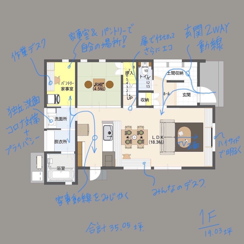 ③洗濯室兼家事室があり、自分専用のスペースが確保できる